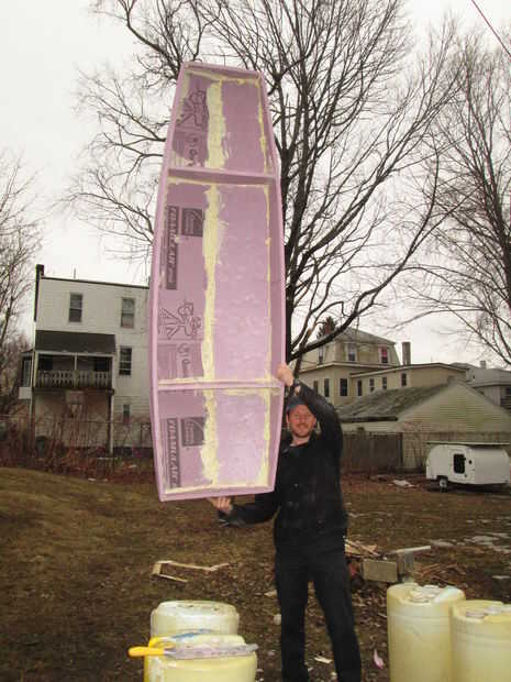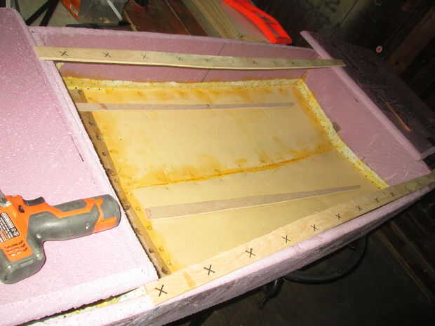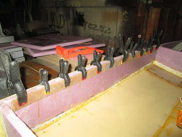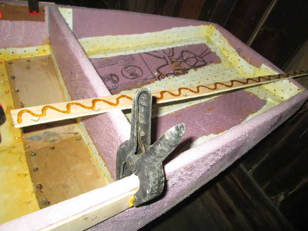 puesto que los lados de la cabina son sólo 1" espuma, sabía que no se levantan mucha fuerza. atado al techo del coche la carga de poner en los rieles por transportista barras y correas abollar la espuma mal, una persona apoyándose en el carril podría dividir el lado de la embarcación. Para combatir esto añadí rieles de madera contrachapada para la parte superior de cada lado de la cabina. Pegado en con GG, los rieles refuerza los lados del barco para arriba perfectamente. He usado izquierda sobre trozos de madera contrachapada de otro proyecto, también puede usar varas para mezclar 5 galones cubo, o palos de barata madera yarda o metro. Mi local Home Depot da las varas para mezclar libre en el mostrador de la pintura.