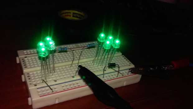 Los LEDs que utilicé fueron 3,2 voltios verde Microtivity LEDs con corriente directa de amp.024 o 24 mA. Si usted toma sus amp horas de batería y corriente directa de los LEDs divide obtienes horas de tiempo de ejecución.