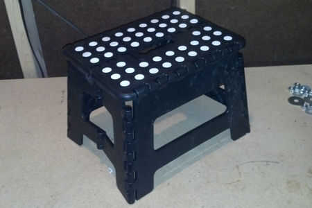 Necesidad de un carro de kayak, que buscaba alternativas para medir, cortar / pegar (maldecir * &$ #! a medida re-corte / volver a pegar) un carro de PVC.  En el proceso, me encontré con este taburete de paso plegable.  (que varían en precio desde $10 - $15 en línea o local store)