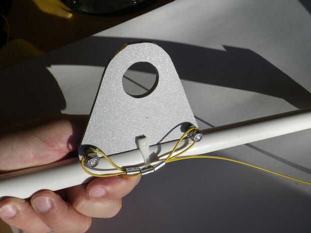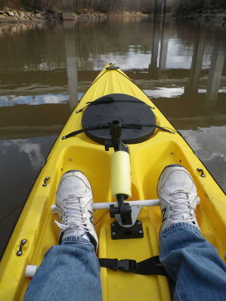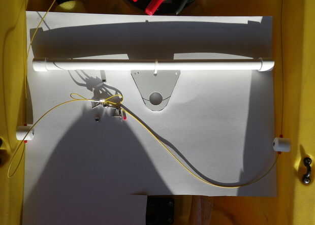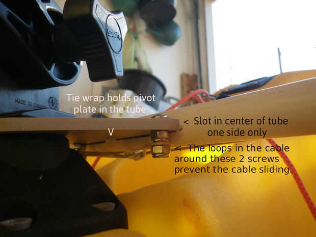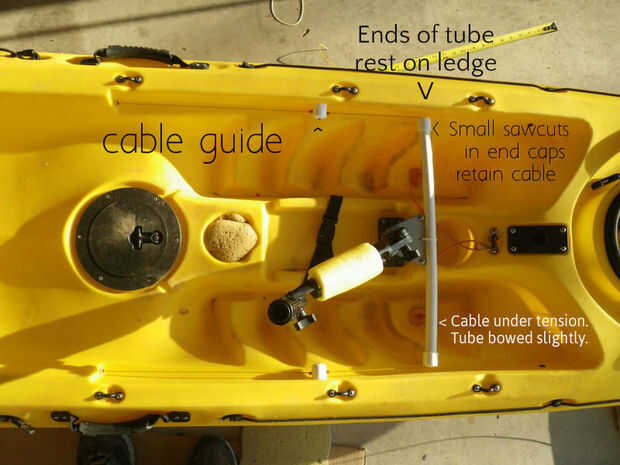 Esta versión utiliza una cruz simple barra pivotante sobre un soporte de varilla que había instalado en el centro de la cabina. (Esta posición de soporte de barra con la extensión es ideal para trolling y reducción de la cantidad que usted necesita inclinarse hacia delante para agarrar la barra. Yo tengo mi buscador de profundidad montada en el más adelante). Este diseño no es ajustable para longitudes de la pierna de diferentes usuarios pero me queda y es extraíble por lo que sólo el cable permanece en su lugar. Cortar una placa de pivote e instálelo en una ranura central para cortar en el lado 1/2" PVC plástico del tubo de retención con un cintillo. Pegar una tapa en cada extremo del tubo que hace la longitud de los tubos a la anchura de la cabina para que los extremos descansan sobre el reborde. Hacer una sierra de corte en la esquina de las tapas para ajustar el cable. Avellane dos 1/2" tapas para un tornillo 10-32 y perfore un agujero de centro en el medio para adaptarse a un pedazo de tubo de 6mm para actuar como una guía de cable. Estos tornillos en las tuercas de reposapiés ya moldeadas en el lado del yak. Los cables de dirección a través de los tubos en los impulsores del cable en ambos lados del hilo de rosca y lazo alrededor de la sierra corta en los extremos del tubo. Únete, atar, conectar, ajustar la dirección. Solía mangas abrazadera oval para crear lazos en el cable ($0,19 cada en Ace Hardware) alrededor de los sujetadores que tenía. He hecho el cable un poco corto por lo que los cables permanezcan en tensión debido a un poco de curva en la pipa.