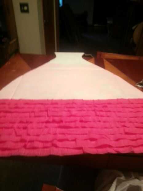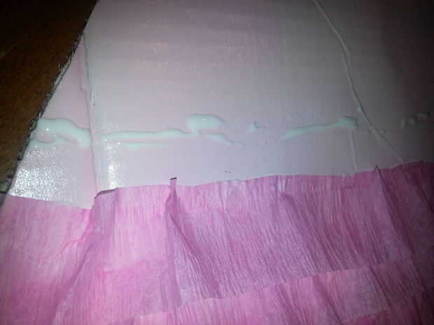 Comience en la parte inferior y empezar a añadir las tiras de papel crepé magenta. Un palillo del pegamento funciona como un encanto para esto. Arrastre una franja de pegamento por la parte inferior de la falda y luego añadir su papel crepe (deja encendido el rollo por ahora). Que palo abajo el papel se reúnen para hacer volantes. No es tan diferente de hacer volantes en piñatas. Al llegar al final cortar el.