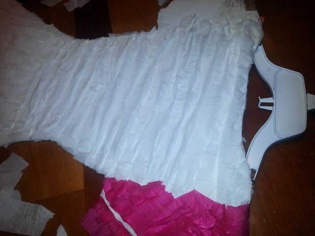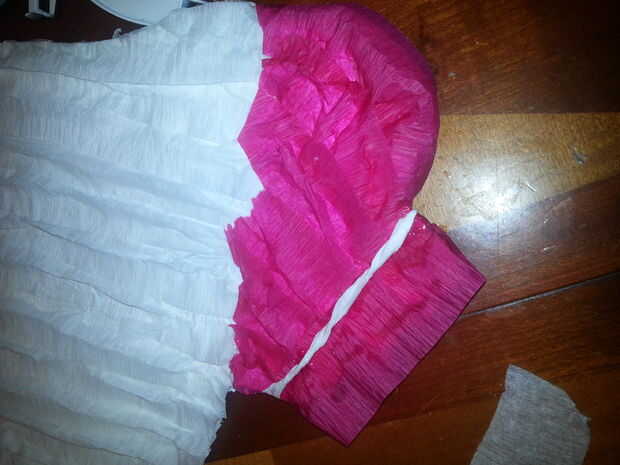 Comience agregando pegamento y luego tomar una tira de papel crepé blanco y reunir horizontalmente. Seguir añadiendo papel blanco hasta la blusa excluyendo las mangas.