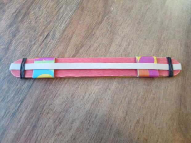 y una de las más pequeñas bandas de goma para atar un extremo de dos palos juntos.