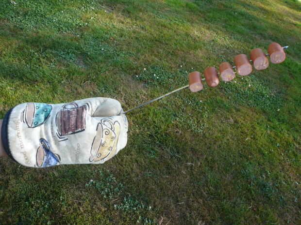 Ponga algunos pedazos de perro caliente en un palo y les tueste un poco, pero no completamente.