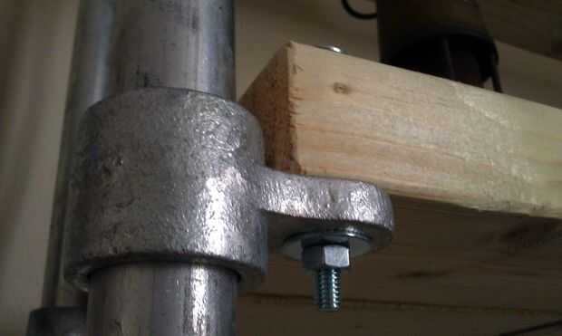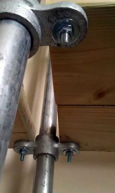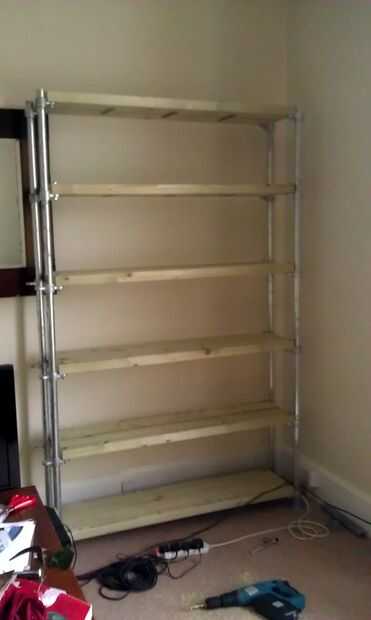 Los postes fueron colocados en el piso y luego el lado soportes se deslizó a lo largo de cada uno de los polos para que sea colocados y apretados en el lugar correcto (solo los soportes donde sólo habría un solo estante y doble donde también apoyar los estantes centrales). Los estantes superior e inferior entonces se perforaron y atornillan (con entrenador pernos y arandelas de penny) a dos de los polos que le apoyan (los que el par posterior). Haciendo esto, yo sabía que los postes al ras de los estantes. Todo se volcó luego que el par delantero de polos podría instalarse luego de la misma manera. El resto de los estantes puede entonces montarse, otra vez sin tener apoyo alguno del peso todo estaba descansando en el piso a. Las bridas de base se ajustaron a los polos y la unidad entonces estaba parado vertical. Todo el proceso se repite para la segunda unidad exterior.