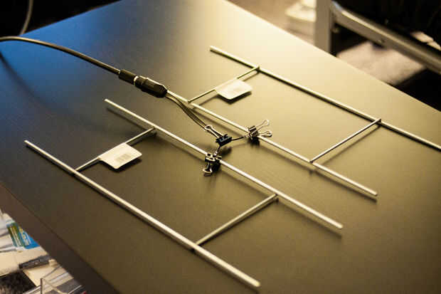 Simple TV antenna kit. Vi esta antena (lknown como la Walltenna) para unos treinta y cinco dólares. No pudimos ver pagar por un diseño simple, así que hicimos una nosotros mismos. Nos sorprendió lo bien trabajado incluso para el modelo crudo que hi
