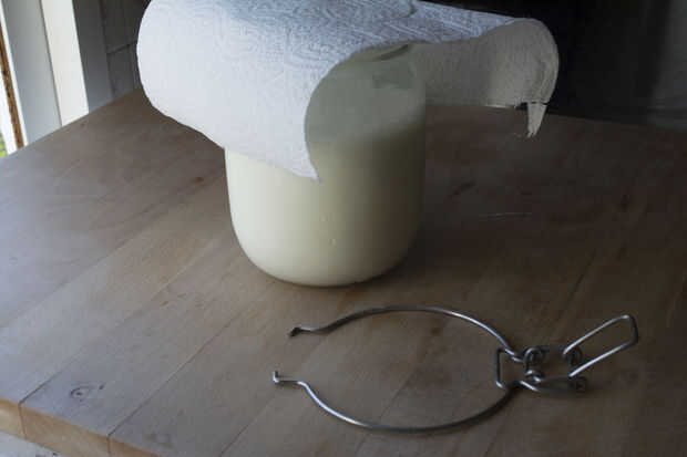 Cubrir con un material transpirable mientras lo dejas fermentar. He probado todo tipo de materiales y sistemas, toalla de tela, gasa o cocina son buenas opciones. Bueno con un par de capas si la gasa de tela tiene un tejido muy abierto, la idea es para aire pero mantenga cualquier bichos. Mi contenedor preferido para esto es un Kilner o tarro superior del clip. La tapa puede ser desmantelada fácilmente y adaptada perfectamente para fermentar el kéfir dentro, vienen en muchos tamaños diferentes que, a medida que crecen sus granos puede actualizar a un tarro más grande.