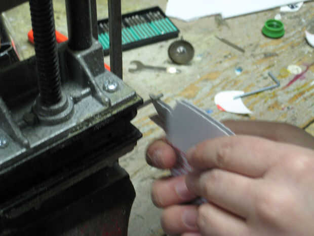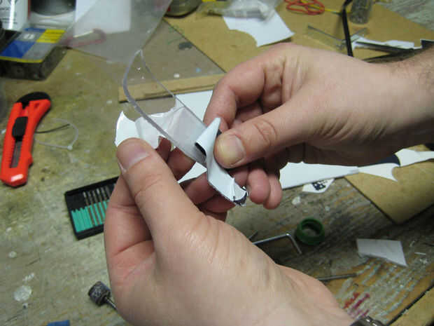 Una vez habíamos pulir los bordes hacia abajo, quitamos el papel protector de la hoja de lexan. En esta etapa se puede ver algún material sobrante alrededor del borde que fue oscurecido por el papel. Usamos un cúter para eliminar este exceso de material.