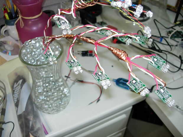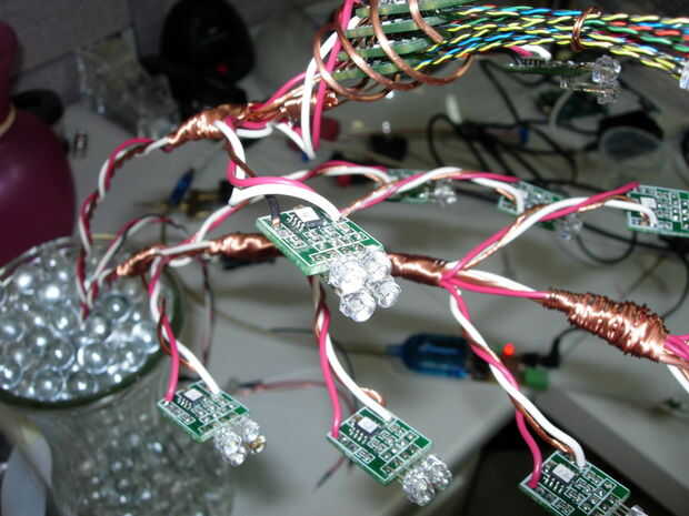 1) construir otro 64 lámparas para tener un total de 128. Quiero iluminar mi árbol de Navidad de este año. Con 512 LED @ 50 vatios debe buscar realmente impresionante! No puedo esperar para programar algo de nieve cayendo mientras el árbol se ilumina con color.