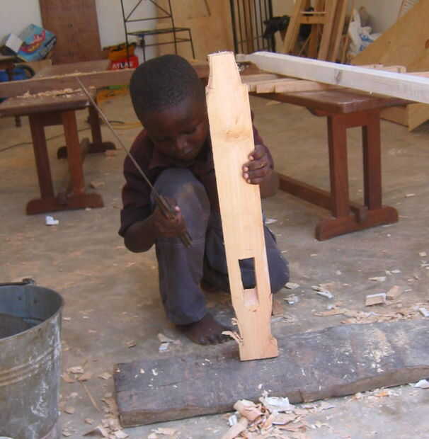 En la segunda foto Powell Muli 9 años tallan piezas de soporte.