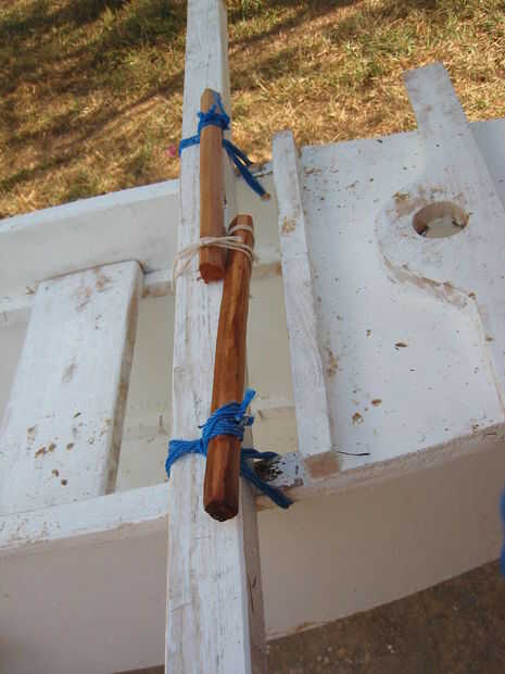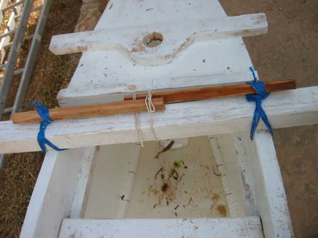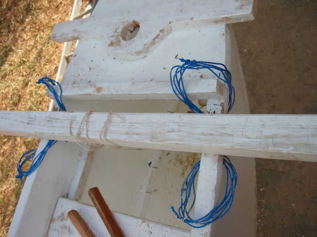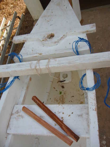 Para unir los travesaños, sólo meter los palillos pequeños a través de los bucles de cable de polipropileno, girar firmemente y deslice los hilos de algodón sobre los extremos de los palillos como se muestra.