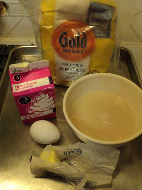 Volcado en su chorrito de crema, mantequilla derretida, la pizca de sal y grieta en un huevo.