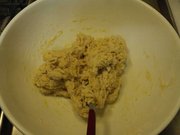 Añadir más harina Si es demasiado húmedo. Usted necesitará obtener una bola pegajosa de pedacitos de masa.