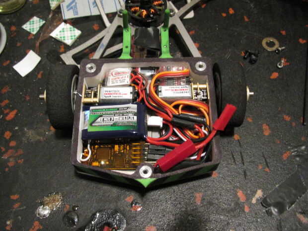 El diseño de la electrónica elaborado muestra la disposición eléctrica general. En el caso de Keres, mezcla se realiza en el transmisor para ahorrar peso y el motor de arma es sin escobillas, por lo tanto un tercer alambre está presente. (Nota, para invertir la dirección de la rotación en un brushless motor con una sola salida direccional usted simplemente intercambio cualquier motor dos plomos)