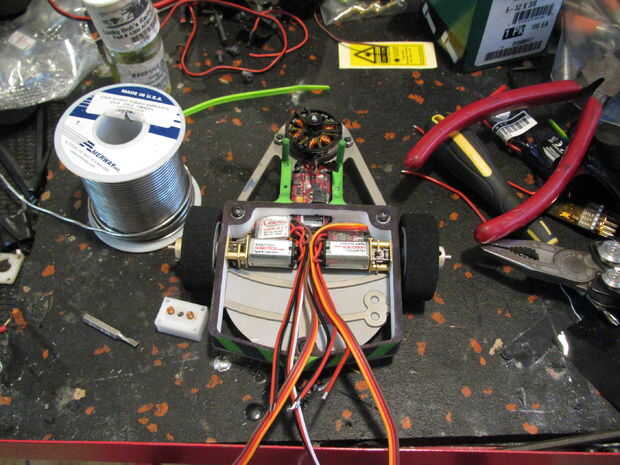 Los cables de alimentación todos ir a un solo conector JST como en este momento el "interruptor" es solo una desconexión mecánica. Esto es pronto para ser sustituido por un interruptor adecuado que permitirá a la batería a permanecer enchufado en todo momento y simplificar la potencia arriba y energía del proceso. Parte del proceso de instalación del interruptor de potencia será el acortamiento de los cables de pwm para hacer espacio para el interruptor y reducir el peso por un margen suficientemente grande para evitar que el robot va sobre el límite de peso de 150g.