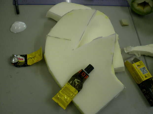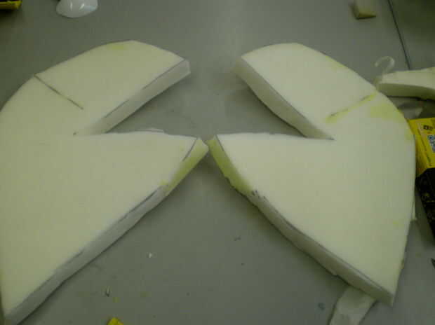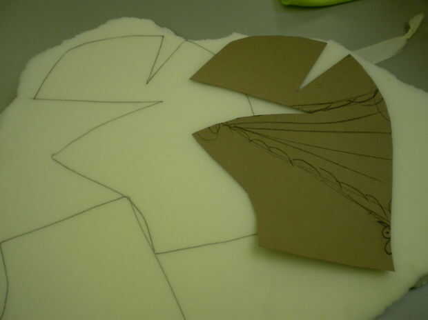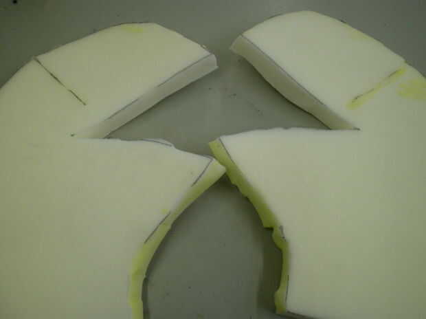 Marcar y cortar dos piezas de la esponja tiene (es una buena idea usar uno más delgado que el que tenía, porque cuando la esponja es demasiado gruesa es un poco difícil de trabajar con el muñeco en el extremo), pero también se puede utilizar lo que encuentres alrededor de la casa