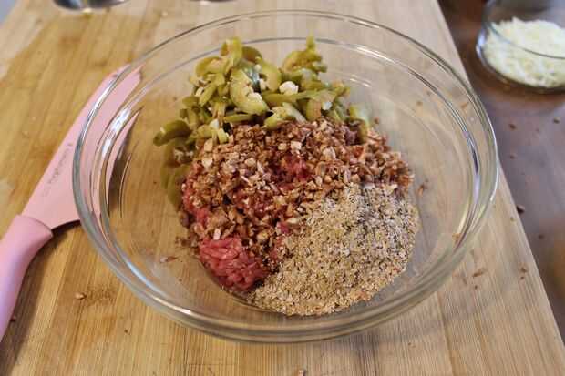 Comenzar por separar los tallos de las tapas. Tire suavemente en un movimiento oscilante para aflojar los tallos, para no dañar el casquillo. Apartar las tapas, picar los tallos y las aceitunas finamente y combinar en un bol con la carne y el salvado hasta bien incorporado.