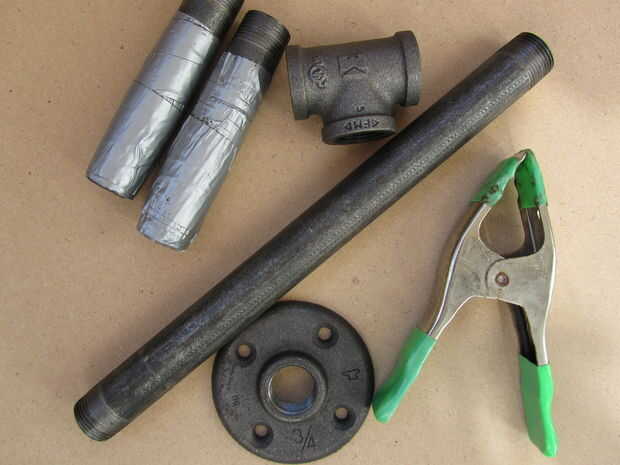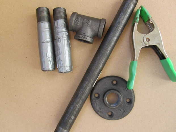 Puede usar acero galvanizado si eres elegante, pero fui a bajo costo hardcore con acero negro. Todos dijeron, $11. Para mí, la brida del piso fue el componente más caro en $4,50 de Ace hardware. La Unión en T y los pezones de cinco pulgadas cada uno cuestan cerca de $2. (Compare eso a comprar kettlebells varias de diferentes tamaños en alrededor de $60 por pop.)