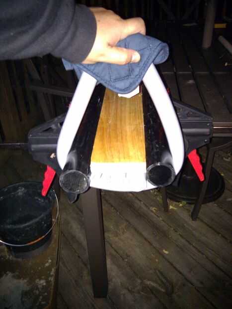 Hay dos opciones que he probado y ambos han funcionado bien. La primera es utilizar una pistola de calor para calentar el PVC hasta que sea lo suficientemente flexible para doblar y formar el mango. La otra es utilizar un horno. Con el método de horno, yo abrigo de PVC con lámina de estaño, coloque en una placa para horno y calentar a 350F por 10min. Después de eso, toda la longitud del PVC es suave y listo para ser doblado.