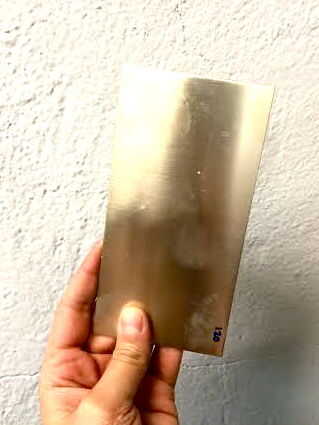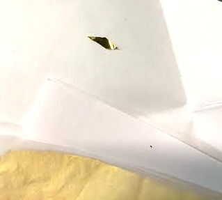 Elegí un triángulo para mi pedazo de muestra (quería asegurarse de que esto funcionó antes de invertir mucho tiempo en mi extensión de técnicas de corte) Recomiendo probar tu placa y herramientas antes de tratar sobre una pieza final. Para una pieza de muestra puede cortar cualquier tamaño o forma para iniciar. Corté una aproximados de 1 "x 1" Plaza de mi hoja de plata. Usted puede comprar plazas muestra corte de Rio Grande o Frei Otto si no tienes un par de tijeras metálicas para corte de metal. Para tu hoja de oro no se olvide de cortar con unas tijeras afiladas y no tocar con los dedos (los aceites en las manos se contaminan el metal y no permite enlazar correctamente, esto es donde usamos el papel como ayuda)! Una vez que tienes el objeto corta plata y pre corta la pieza de oro de la energía su placa ON.