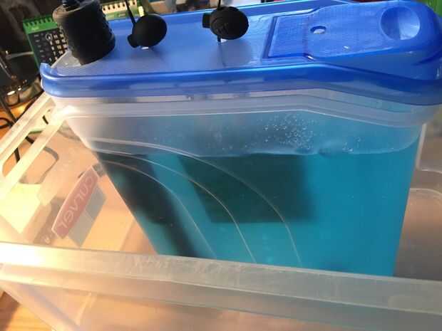Hierna kan het en een bak metammoniumpersulfaat oplossing gestopt worden zodat het koper opgelost wordt. Zorg ervoor dat deze vloeistof en beweging blijft zodat het koper goed oplost. DIT kan ongeveer een medio uur de meer duren.