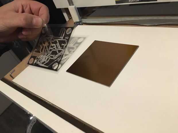 Pierna het printplaatje op de fotogevoelige epoxyprint en belicht het voor 10 minuten cumplen UV licht.