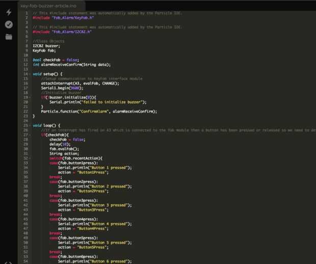 Haga clic en el icono blanco de la izquierda y asegúrese de que el módulo del fotón partícula está conectado y seleccionado aquí. Haga clic en el icono de las bibliotecas de la izquierda, luego buscar las bibliotecas de la comunidad Fob_Alarm. Asegúrese de que la ficha clave-fob-zumbador-article.ino se selecciona, a continuación, haga clic en usar este botón de ejemplo. Ahora haga clic en el icono de dispositivos de la izquierda (aspecto objetivo) y asegúrese de que el controlador está en línea y seleccionado. Ahora haz clic en el botón Flash a la izquierda (similar a un perno del relámpago) para flash el firmware en el controlador. Después de que el módulo es flasheado con este firmware y luego se reinicia ya está listo. La fuente completa para este firmware está disponible en nuestro repositorio de GitHub.