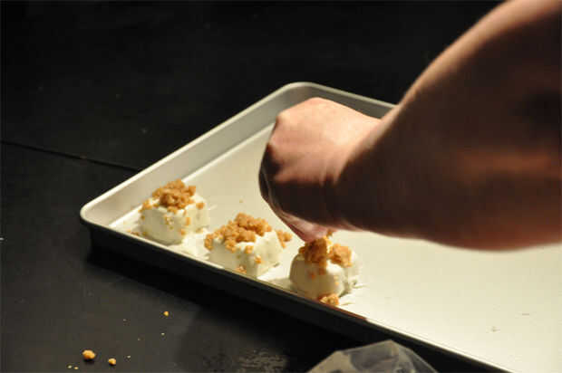 Tenga en cuenta si utilizas un chocolate blanco no hecho para el moldeado que se necesita templar antes de sumergir. Esto generalmente significa fusión 3/4 del chocolate a unos 85 grados blanco, retirar del fuego y agregar el resto del chocolate, revolviendo hasta que se derrita también. Es mejor seguir las instrucciones del fabricante.