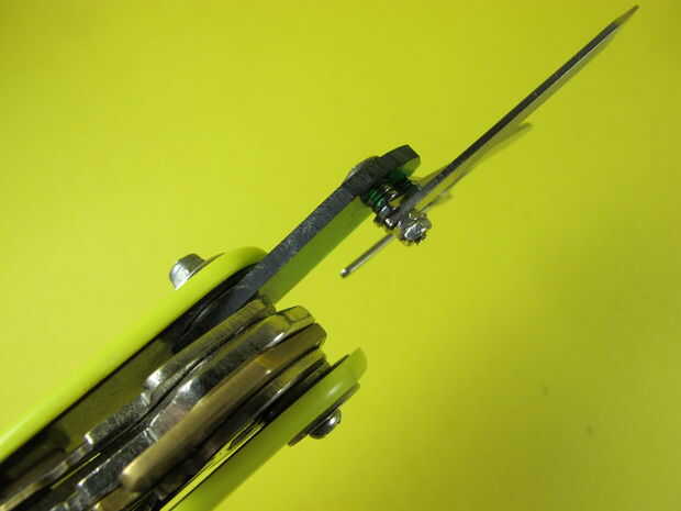 Puesto que es un cuchillo pequeño, usar tornillo M2 y asegurarlo en un trozo de lámina de plástico, creo que es la fuerza de trabajo por lo menos que tienes que hacer.