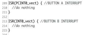 Las otras dos funciones, ISR(PCINT0_vect) y ISR(INT0_vect), realmente no hacen nada. Simplemente se declara con la interrupción de los dos botones para el microcontrolador.