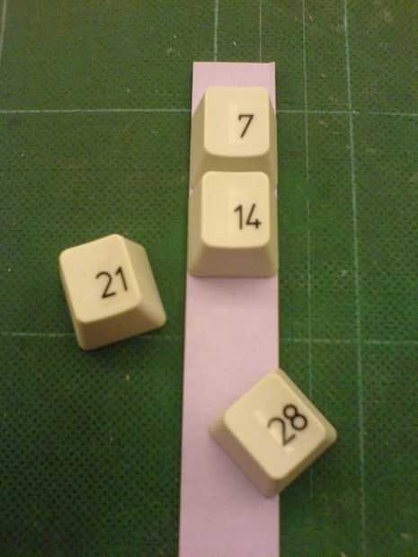 Las llaves se arreglan en tiras mismo ya que los días 7, 14, 21 y 28 debe ser el mismo día de la semana en el mismo mes. Así como a los demás. Las teclas con el 29, 30 y 31 autónomo. Así que cuando se hace el trabajo, debe tener 7 tiras con 4 teclas y 3 llaves separadas.