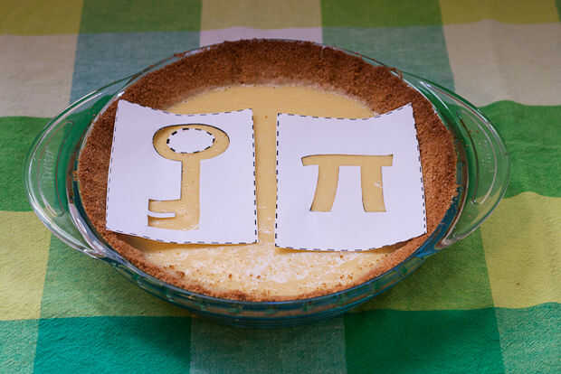 Aquí está la diversión parte. Imprimir la plantilla. Cortar las piezas negras para que tengas dos plantillas: una con un agujero con forma de llave y otro con un agujero en forma de pi. Corte alrededor de la línea de puntos de la elipse. Coloque las plantillas en su pie. Asperjar el brillo comestible o azúcar en la parte superior. Con cuidado quite las plantillas. Coloque una rebanada de cal en el medio.