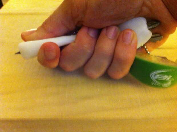 Cómo agarre sus destornilladores nuevos dependerá de cuáles son sus preferencias de comodidad. Te recomiendo la siguientes la técnica se muestra en la imagen de abajo. Asegúrese de que ambos destornilladores son uno frente a otro, agarre el destornillador que vas a usar con el dedo pulgar y dedo índice, luego agarrar las llaves, cadena dominante y otras screwdriver(s) entre su palma y los otros dedos.