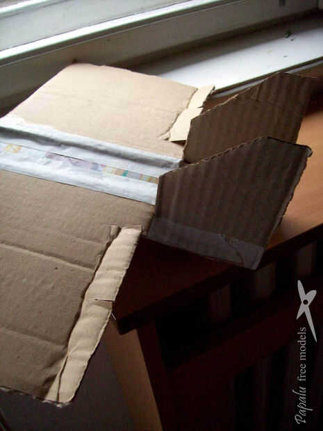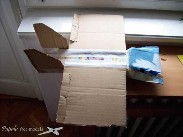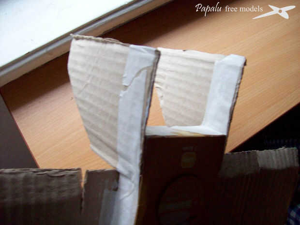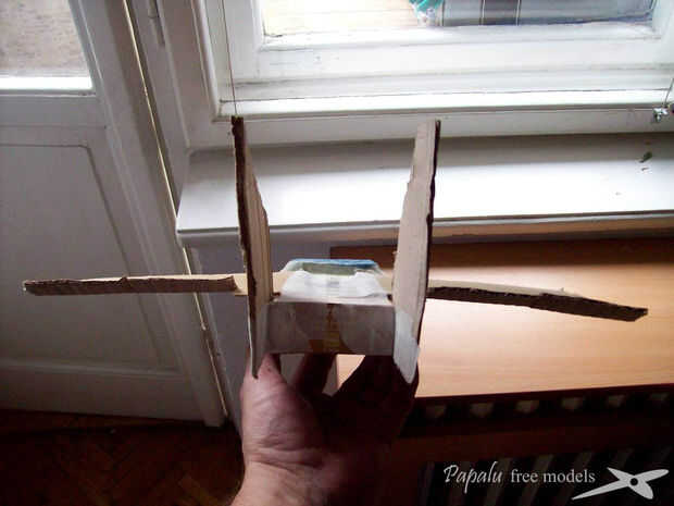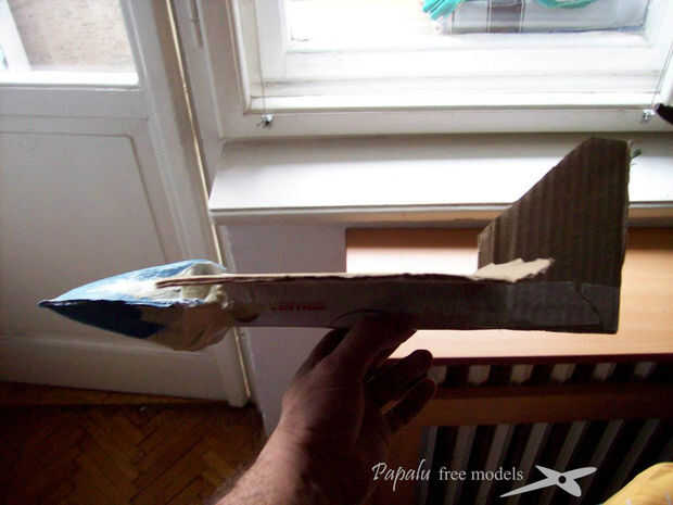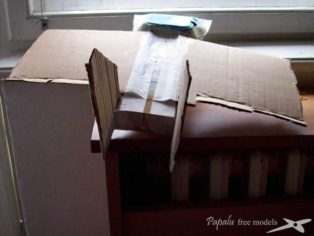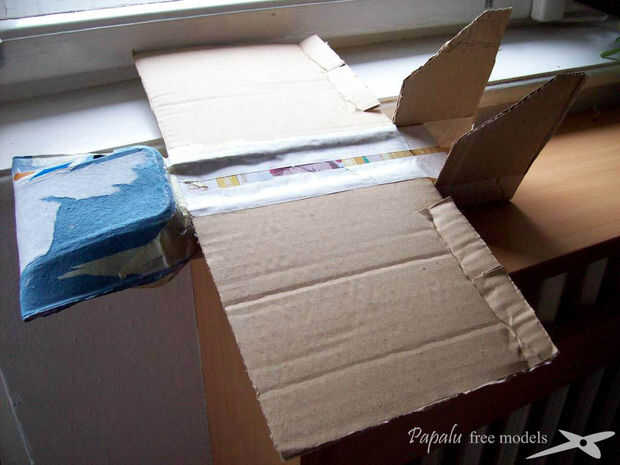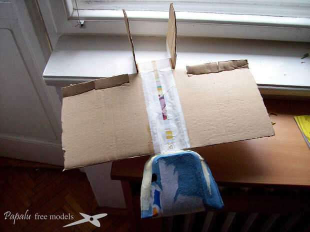 Todas estas piezas se hacen de cartón típico de cajas, pegado y fijado con cinta de papel. Aquí hay fotos de diferentes ángulos. En las alas, hice alerones y flaps, simplemente cortando con las tijeras, poco en el ala. Entonces estas piezas de la curva hacia arriba y hacia abajo, y esto funciona; puede fijar esta superficies en distintas posiciones para ajustar y corregir el vuelo del modelo.