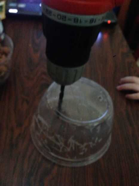 Ahora, hasta el verdadero primer paso. Esto podría ser la parte más peligrosa de su proceso de construcción todo después de comer la comida que vino en las copas. Perforación 1 orificio en cada lado de la taza. Agujeros en la tapa para reducir la posibilidad de mi semillero de la descomposición en el aire estancado también perforados.