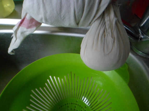 -Tomar un paño de alcachofa y queso. Vierta el cuajar paño de queso.