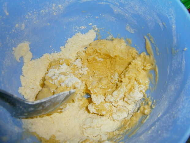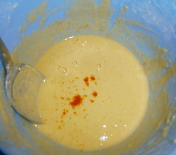 La mezcla debe ser de textura que puede fluir a través de agujeros en la cuchara suavemente.