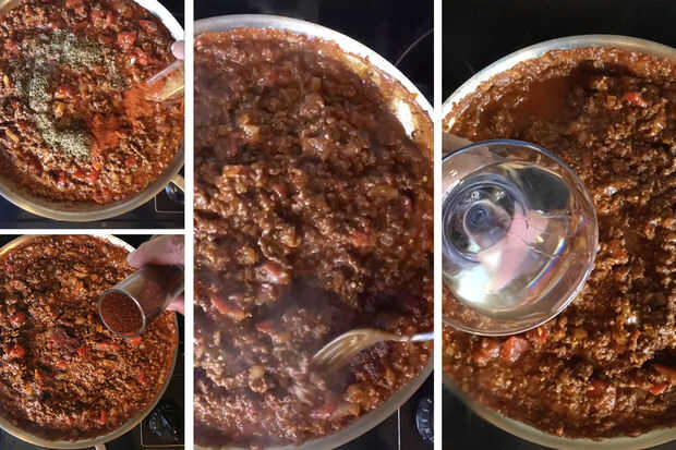 Cuando se agregan que las especias finales permiten 5 minutos entre los tres primeros y el final. Esto da tiempo para el primer conjunto de especias que se mezclan. Si Chile empieza a espesar demasiado, puede añadir agua en cualquier momento de este proceso.