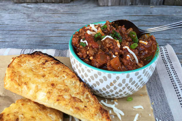Pataleando y gritando su manera en su corazón. Un tazón de Chili de carne de Kick'N recta con la CheezzyBread de parmesano es un partido en el cocina cielo. Todo lo que te falta es una cerveza helada o dos.