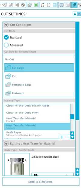 -tipo de material = > "material de transferencia de calor" (suave en mi caso, pero adaptar a la tuya)