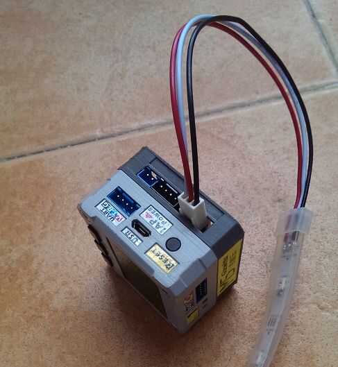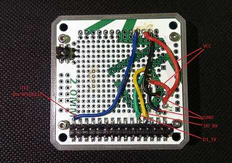 Y en el otro lado, soldar algunos cables con el conector correspondiente y añadir uno de 3 pines del zócalo de la tira de LED, el correspondiente pin de control base M5 es D11.