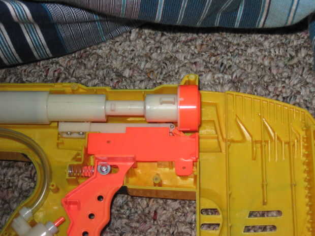 Aquí es un mod muy rápido para su pistola de nerf de sacudida. Parte de la palanca de carga a veces le pegaría a mi mano que afectan el flujo de aire y producir la menor distancia de disparo. Cortando sólo un extremo de la manija en forma de T siendo