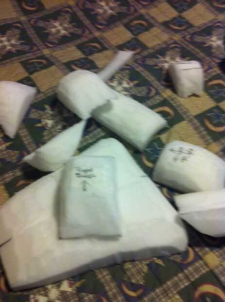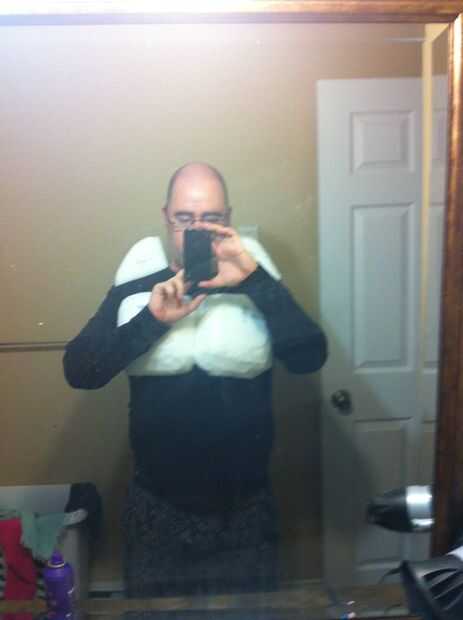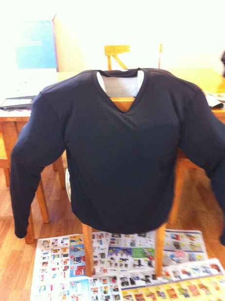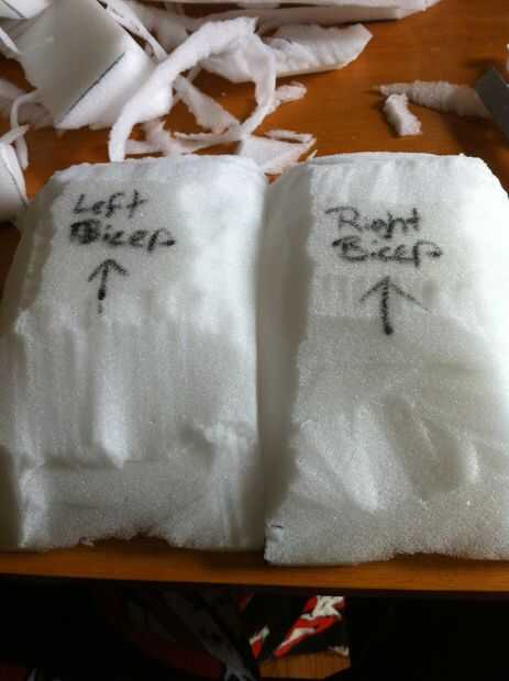 Una vez que los grupos musculares tallados que coser en la parte superior la primera camisa de entrenamiento; el más pequeño de tamaño uno. Usted querrá probar la camisa periódicamente para asegurarse de que la colocación es buena. Una vez tengas los músculos cosidos en, podrá montar la camisa más grande en sobre ella y coser las dos camisetas juntas a las muñecas, la parte inferior y en el cuello. NO coser todo alrededor de las aberturas, lo suficiente como para conectarlos juntos para que no separe cuando usted está tratando de encendido/apagado el traje. Unas puntadas en cada punto es suficiente.
