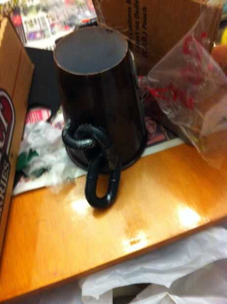 Los grilletes de la muñeca se hacen de los vasos de plástico. Otra vez Asegúrese de que estos son lo suficientemente grandes para caber sobre sus antebrazos pero sin embargo, el tiempo suficiente para darle el aspecto adecuado. Tiendas de dólar son minas de oro de props. Acaba de decir. Va a cortar un extremo, luego pintura marrón con la pintura en aerosol y luego aplique algunos negro manchas a la suciedad hacia arriba. Luego corte un eslabón plástico por la mitad así que usted puede pegar en la parte de la Copa. Asegúrate de que tienes unos eslabones de cadena en allí también antes de pegarla en!