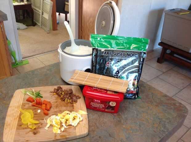 Este es un gran aperitivo Coreano. Me gusta porque es un fácil de hacer bocadillos. Es saludable. 30 minutos para hacerlo.Paso 1: Reunir los ingredientes Usted necesitará los siguientes ingredientes:arroz, 1 cucharada grandealgas marinas, 1 hojajamón