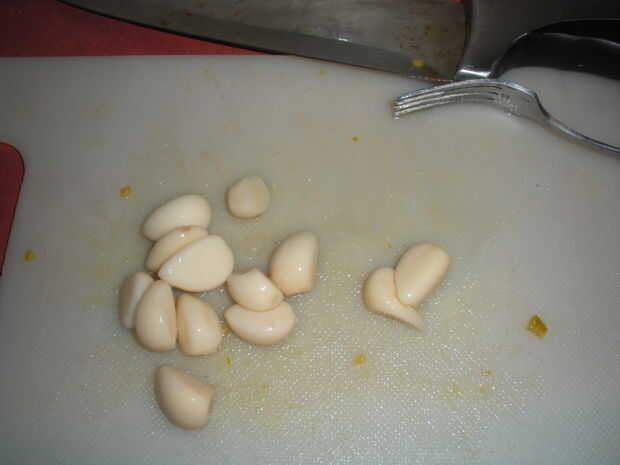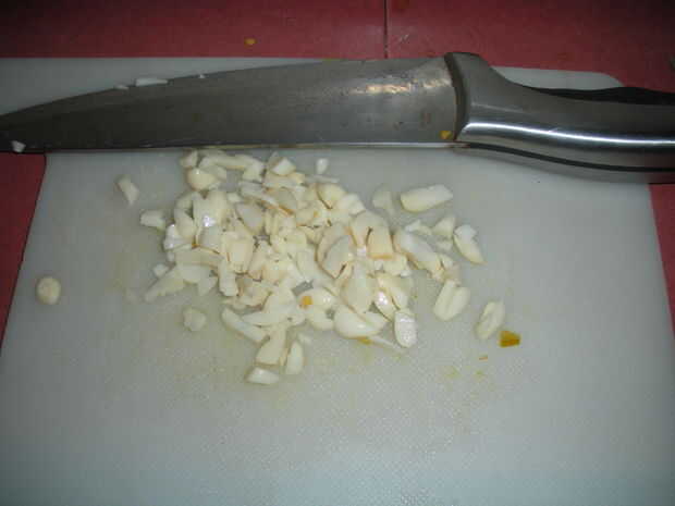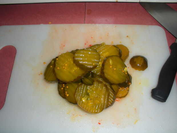 mientras la col fue Salar cortar los jalapeños en vinagre, ajo, pimientos rojos y dulces encurtidos en una tajada áspera