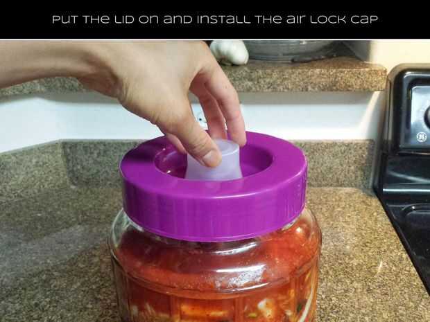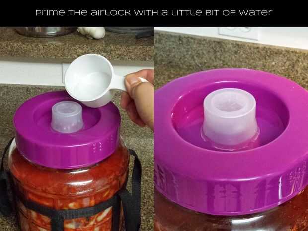 El bolsa de aire permite a los gases producidos durante la burbuja de la fermentación hacia fuera mientras que evita que las moscas y las esporas de moho entren en el frasco. Esto sirve los mismos propósitos que el foso llenado de agua en los cántaros de fermentación de gres estilo europeo. La fermentación comienza, de vez en cuando ver burbujas de aire fuera eructos.