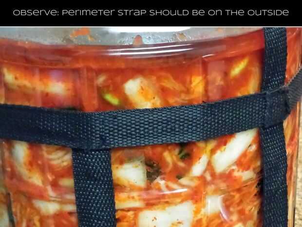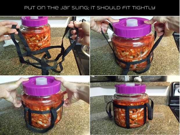 Antes de poner en la eslinga de tarro, desenrolle cualquier correas torcidas o enredadas y asegúrese de colocar la eslinga con la cinta perimetral en el exterior. Ponga la jarra aproximadamente sobre el medio (no importa si la jarra está sobre parte de la correa del perímetro) y jale el asas mientras empuja hacia abajo sobre el vaso. Girar el frasco 90 ° y tire el perímetro de la correa para arriba para asegurarse de que la eslinga está equipado perfectamente en la jarra.