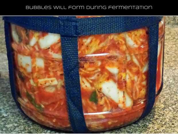 Deje el kimchee fermentado a temperatura ambiente durante una semana. El principal cambio en el carácter de kimchee impartido por fermentación es acidez; el kimchee desarrolla un sabor ligeramente amargo (más o menos similar al sauerkraut) y aromas más complejos que estaban allí antes de la fermentación. También, las partes crujientes algo duras de la col se convierten mucho más tiernas.